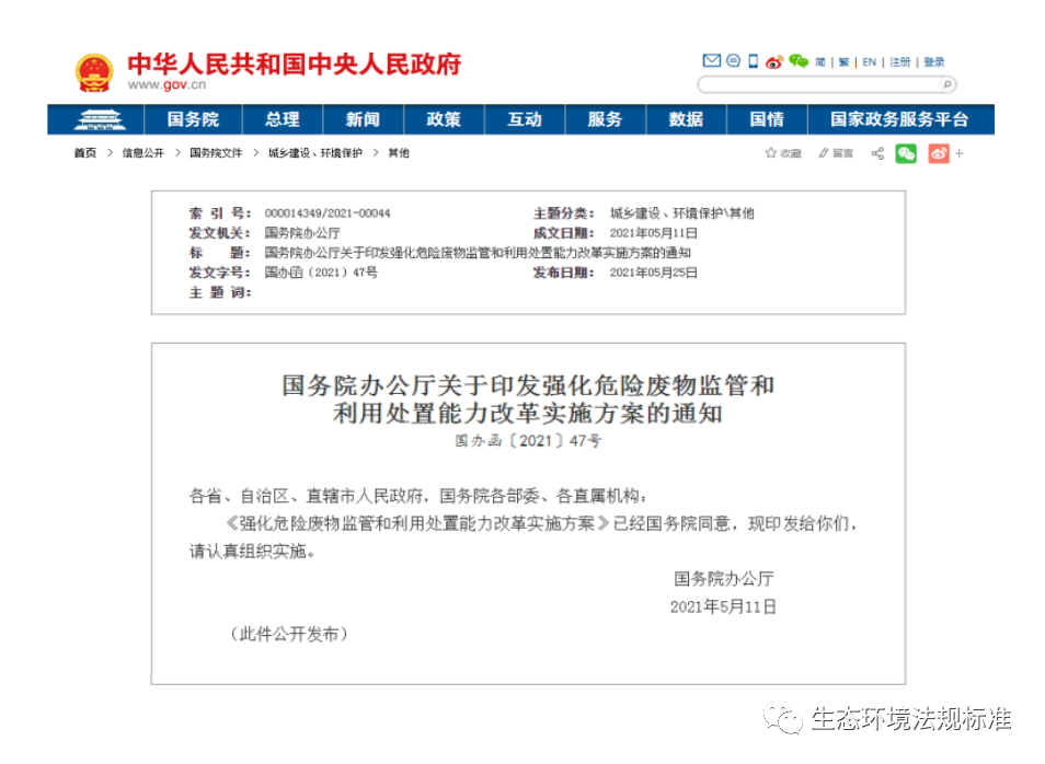 《强化危险废物监管和利用处置能力改革实施方案》已经国务院同意,现印发给你们,请认真组织实施。