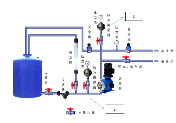 计量泵出口不能憋压,当出现泵出口压力过高时,安全阀会打开,使得泵回流回溶液箱泄压,起到保护泵的作用。