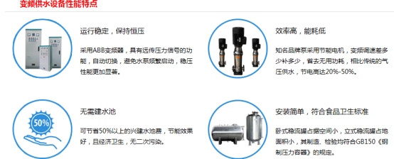 变频恒压供水设备是高效节能的高智能型二次供水设备,变频恒压供水设备能根据管网用水量及水压变化,通过对管网的微机检测、运算、反馈等过程实行无级调速来保持水压恒定从而满足用水要求。与传统的水塔、高位水箱、气压式等供水设备相比,不论是水质、建筑成本、运行的经济性、系统的可靠性及智能化程度等方面都具有显著优势。
