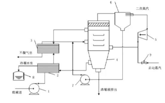 即外加一部分压缩机做功来实现循环蒸发,从而可以不需要外部鲜蒸汽,依靠蒸发系统自循环来实现蒸发浓缩的目的。