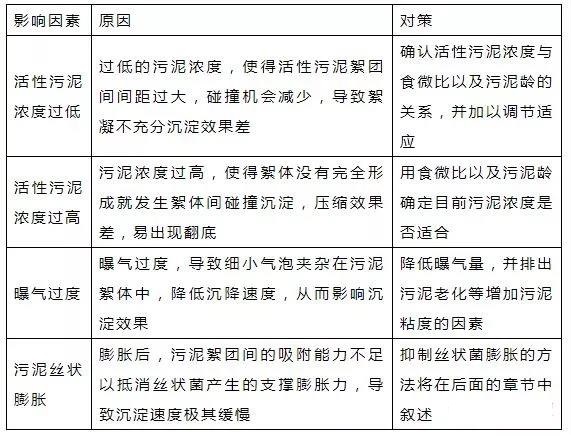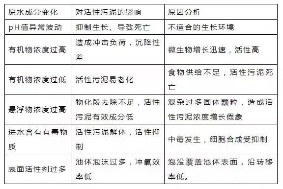 | | | 进水含有大量溶解性有机物,使污泥负荷F/M太高,而进水有缺乏足够的N、P或DO,污泥结水率高达400%以上,远大于100%的正常水平 | 控制进水稳定,通过投加N、P等营养物质氏营养均衡,提高曝气池溶解氧浓度。 |