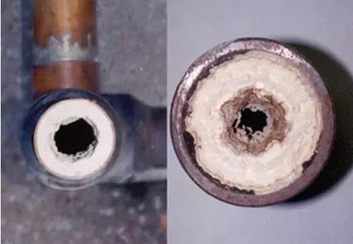 过去热水管道多采用镀锌钢管,镀锌钢管初步锈蚀后水垢在疏松锈面上着床,碳酸钙、碳酸镁再与锈蚀层产生化学反应,在热水的作用下加速锈蚀,一般一两年后,管道通径缩小30%以上。并伴有黄水(锈水)产生,直至5-8年左右管路无法使用。