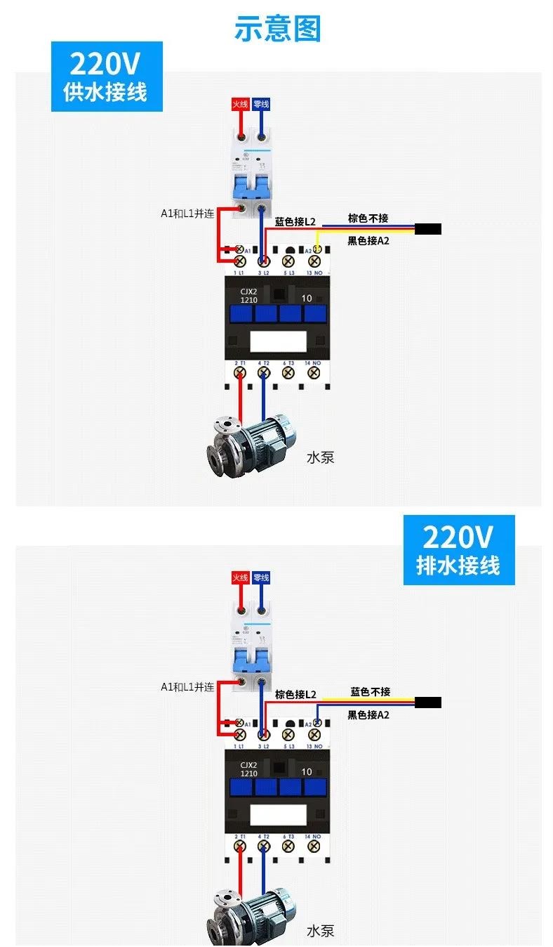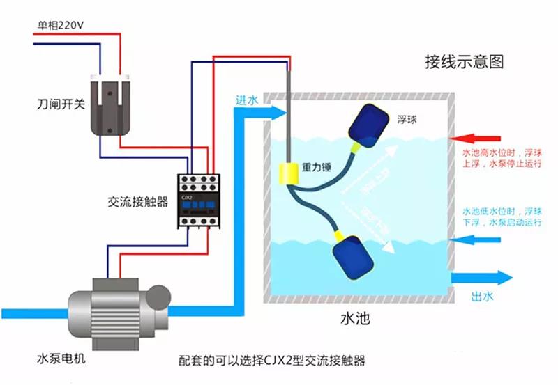 ①使用黑色和蓝色的电线:浮球在上液位时,接点是不通的状态。浮球在下液位时,接点是接通的状态。