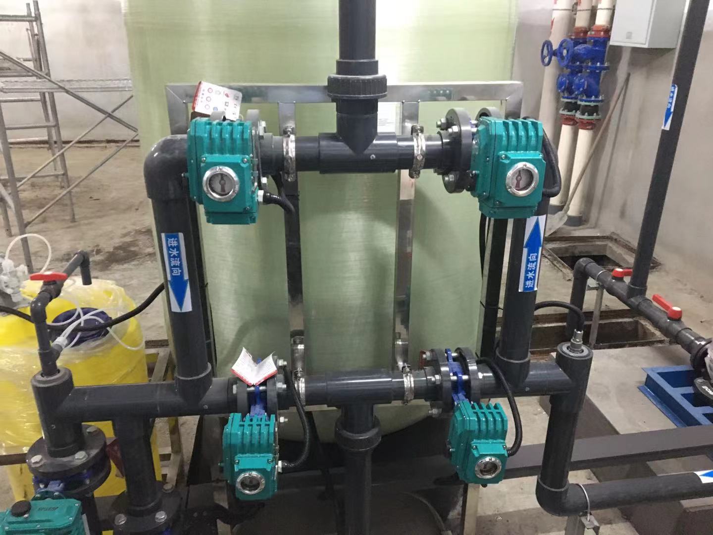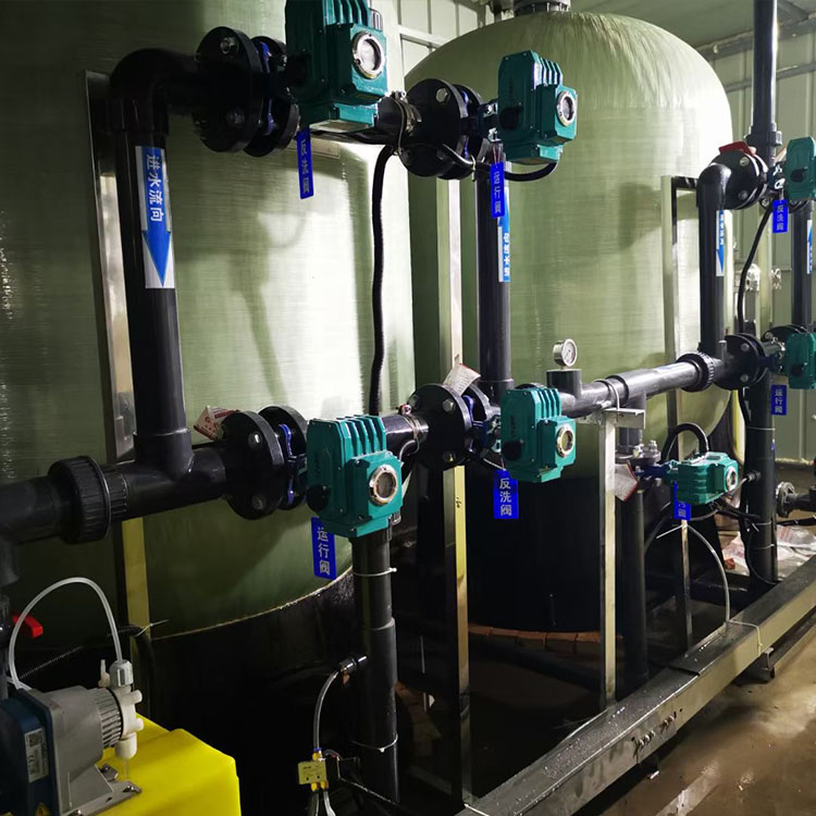 机械过滤器设有反洗水进口限位蝶阀,控制和调节反洗水流量,反洗强度应使滤层膨胀15-25%,反洗压缩空气强度一般在10-18L/S.m2。如无压缩空气可考虑用罗茨风机。