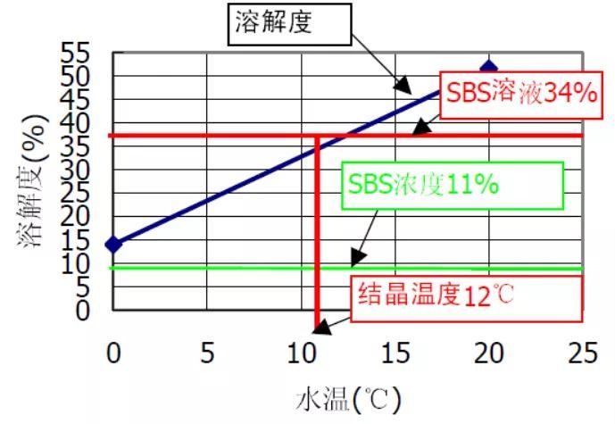 亚硫酸氢钠的溶解度随温度降低而降低。如下图所示,当亚硫酸氢钠浓度为34%时,如果温度低于12℃会结晶;而亚硫酸氢钠浓度为11%时,即使在0℃也不会结晶。
