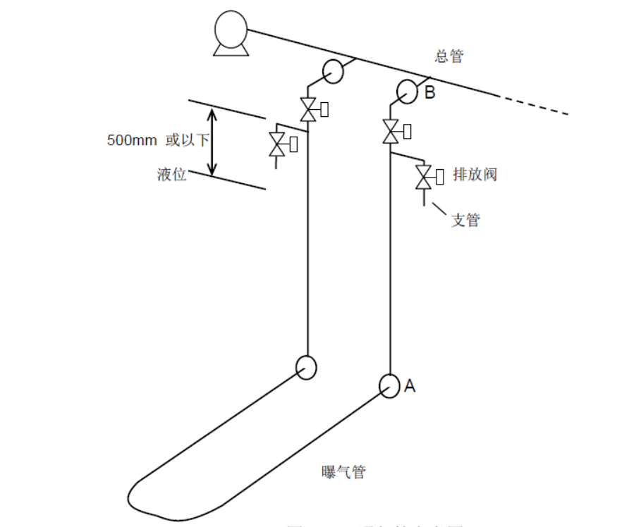 在供气管道的进气管路上,需安装用于清洗曝气管的支管和阀门。建议支管安装于在液位以上500mm的范围内。