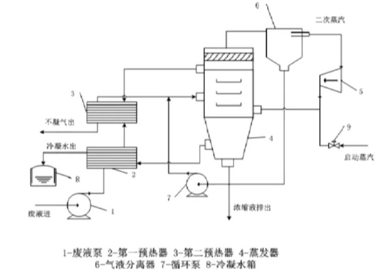 物料经过加热产生的二次蒸汽,通过压缩机压缩成为高温高压的蒸汽,在此产生的高温高压蒸汽作为加热的热源。蒸发腔内的物料经加热不断蒸发,而经过压缩机的高温高压蒸汽通过不断的换热,冷却变成冷凝水,即处理后的水。压缩机作为整个系统的热源,实现了电能向热能的转换,避免了整个系统对外界生蒸汽的依赖与摄取。