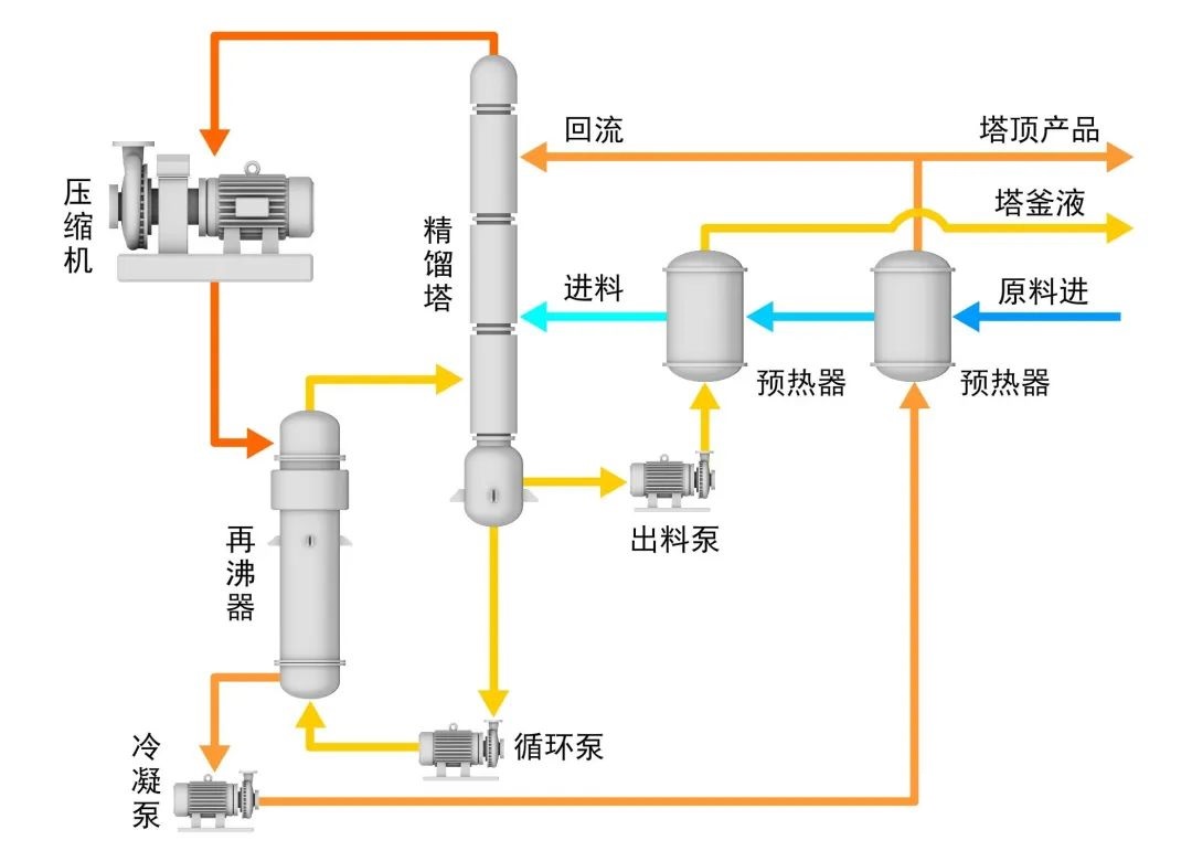 如上图,在MVR系统中,预热阶段的热源由蒸汽发生器提供,直至物料开始蒸发产生蒸汽。