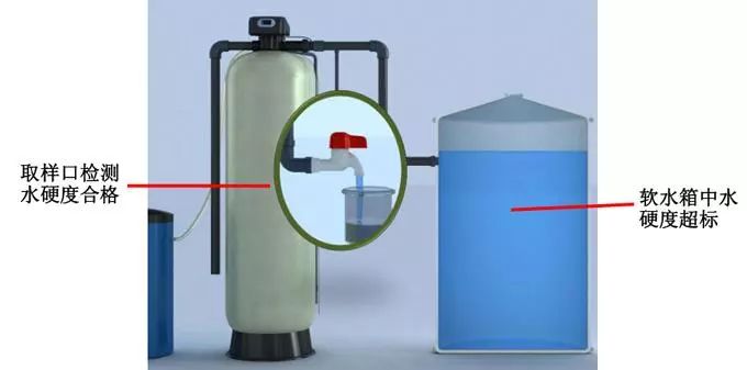 在软化水设备的取样口检测是合格的,但软水箱中的水硬度超标,说明软水设备制水效果不稳定,曾有超标水注入软水箱。