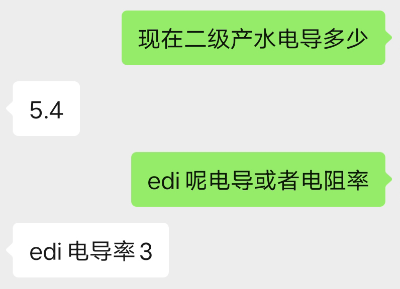由于条件有限,最终EDI进水电导维持在3μs左右,经过十几小时连续高电流运行EDI以再生,EDI产水水质最终恢复正常: