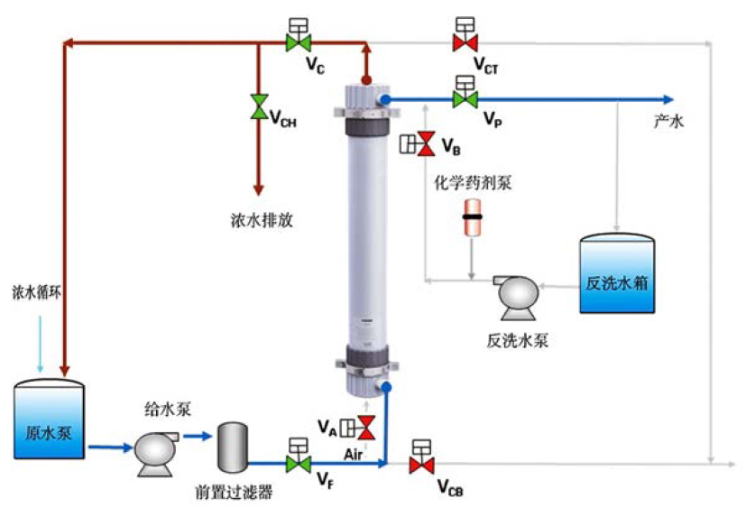 反洗:是从膜的产水侧向进水侧用压力推入水,以去除附着在膜表面的污染物质的方法,是物理清洗的一种。通常使用膜过滤水作为冲洗水。