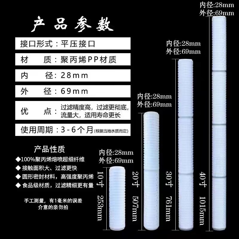 PP棉滤芯特点:滤芯精度范围0.5-100μm,其通量是同等精度蜂房滤芯的1.5倍以上,可配置不同型号的端盖接头,满足各种工程安装的需要。