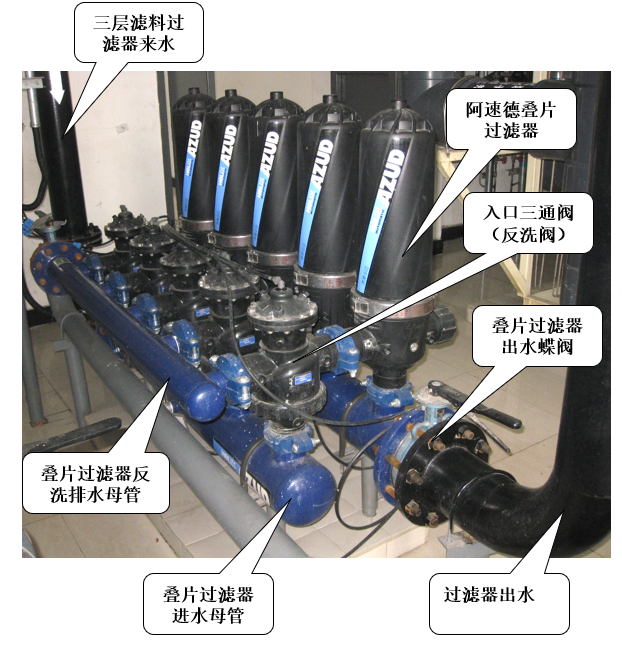 水流从进水管进入,流经三向液压阀,到达叠片过滤器中。水流进入过滤器,杂质被留在叠片上。水流通过叠片,在这个过程中进行深层过滤。过滤完毕的水,通过出水管排出。