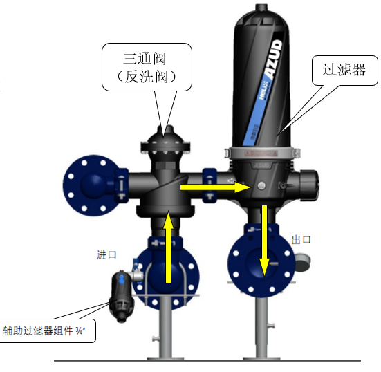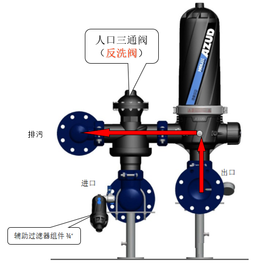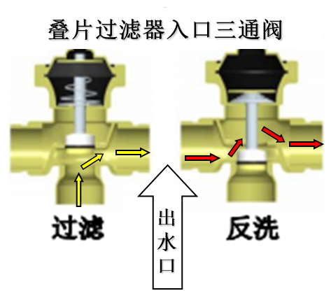 通过三向液压阀,关闭过滤器进水口,使过滤器内部与排污管相连接,实施反洗。出水管内过滤的水,反方向进入过滤器,产生不同的压力,由此进入反洗阶段。