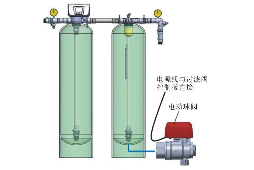 过滤阀可选时间型或流量型,可在系统进、出水口安装压差传感器,利用自动过滤阀的远程控制端口实现冲洗;还可在曝气罐底部加装排污球阀,设定时间定时排污,防止曝气罐内的铁锰沉淀物在停机时间长时结块。