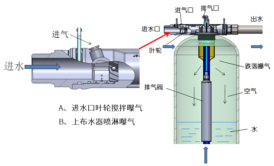 原水通过水泵抽入曝气罐,流经进水口叶轮,被分流成多股小水流,同时压缩空气经除铁锰装置进气口通入,与水混合,和被叶轮分流的水进行一次曝气,称之为“叶轮曝气”;水和空气继续到曝气罐的上布水器,再次曝气,称之为“跌落曝气”。