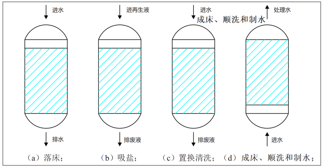 再生时盐水流动方向与制水运行时水流方向相反称为逆流再生。逆流再生,盐水首先接触到的是树脂失效程度较低的保护层,树脂再生程度更高,出水水质更好。