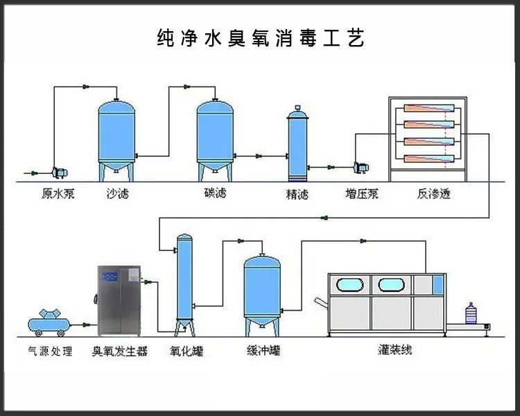 水处理系统中一般是反渗透系统和消毒系统配合使用的,因为反渗透系统过滤时并不能过滤原水中所有的细菌、病毒。而有些细菌对人体是有害的,所以需要在过滤之后再进行一次消毒。臭氧消毒作为常见的一种消毒方式,是通过氧化作用破坏微生物膜的结构,杀灭细菌繁殖体和芽孢、病毒、真菌等,还能够破坏肉毒杆菌霉素。