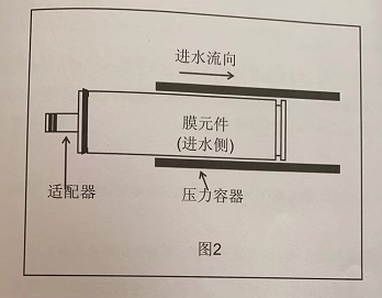 (4)按照膜元件表面箭头所指的方向将其平缓的推入压力容器,至膜元件三分之二进入压力容器后,在膜元件的进水侧产水管上插上适配器,如图2所示。