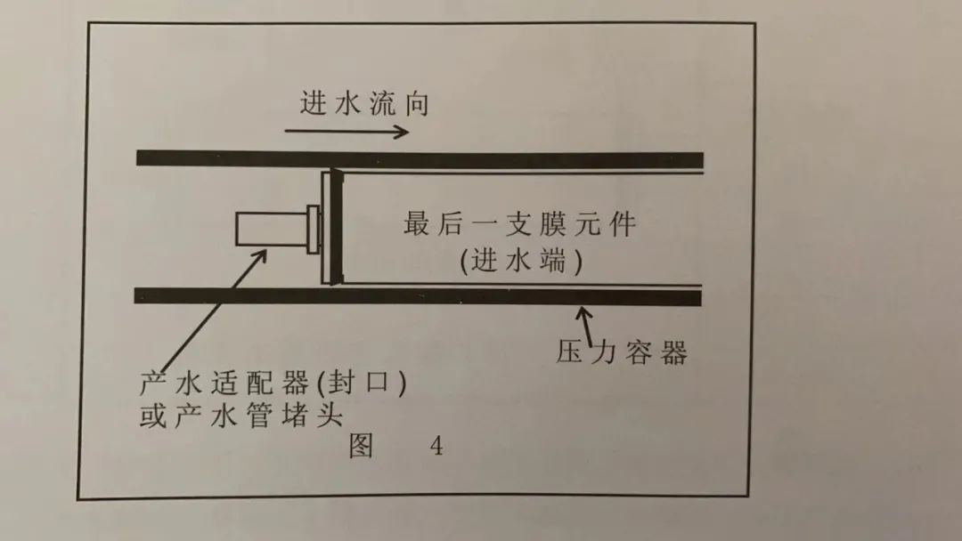 (6)当同一压力容器内最后一支膜元件安装完毕后,在膜元件的进水端插上闭式产水适配器上或套上产水管堵头,见图4。