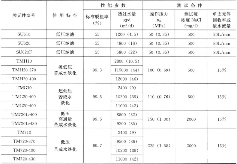 目前,各生产厂家均有多种不同类型的膜元件,根据进水类型、脱盐率、操作压力、设计能力等要求,从中可以选择合适的膜元件。