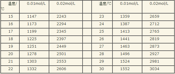 电导率校正可以用0.01mol/L和0.02mol/L氯化钾溶液校正,具体方法:将待校正的电导电极置于0.01mol/L或0.02mol/L的氯化钾溶液里,用精密恒温水浴保持氯化钾溶液为不同的温度,将测得的电导率与下表对比,可以测知未知常数电极的电极常数,也可对其做校验。