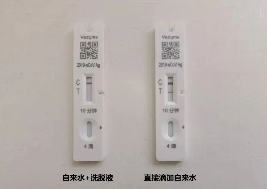 分别在安徽家中、北京某高校宿舍的两名“阳康”的研究生同学利用手头剩余的新冠抗原检测试剂盒,试图还原某公众号中提到的测试过程,“先用抗原试剂自带的滴管装入自来水,然后再将其滴入抗原测试板上”。同学们尝试类似操作,发现滴管中不加洗脱液或者直接用棉签蘸取自来水到采样口时,确实有些水样会出现所谓的“两道杠”(下图右侧)。