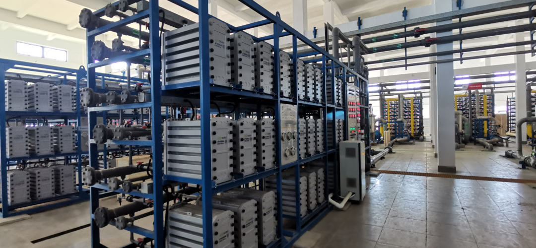 广东某大型印染污水处理厂,项目原水为印染废水,工艺流程为生化处理+多介质+超滤+双级反渗透+EDI,EDI装置一共5套,每套25台单台产水量为5m³/h的E-CELL-3X, 总EDI产水量为500m³/h。该设备于2021年初开始投入使用,使用半年多后,该4套设备均出现一定程度的产水量下降情况,并且EDI浓水量均下降到风险值,虽然该设备产水水质电阻率依旧稳定在16兆欧。但是担心过低的流量会对模块造成损伤,于是由我司对该厂EDI设备进行勘察和清洗指导。