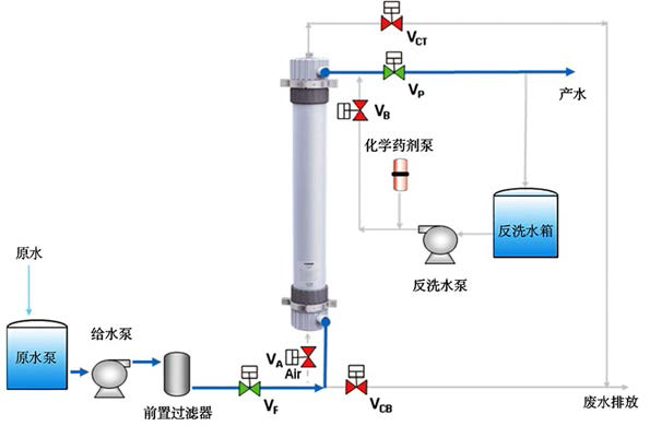 此过滤模式与传统过滤类似,进水进入超滤膜组件,全部透过膜表面成为产水从超滤膜组件过滤液侧流出。被超滤膜截流的悬浮物、胶体和大分子有机物等杂质通过定时气擦洗、水反洗和正洗以及定期的化学清洗过程排出膜组件。