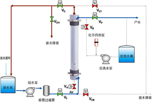 当超滤进水悬浮物、浊度较高时,比如污水或者污水回用处理应用,超滤可按照错流过滤模式操作。进水进入超滤膜组件,部分透过膜表面成为产水,另一部分则夹带悬浮物等杂质排出膜组件成为浓水,排出的浓水重新加压后又循环回到膜组件内,保持膜表面较高流速产生的剪切力,把膜表面上截流的悬浮物等杂质带走,从而使污染层保持在一个较薄的水平。
