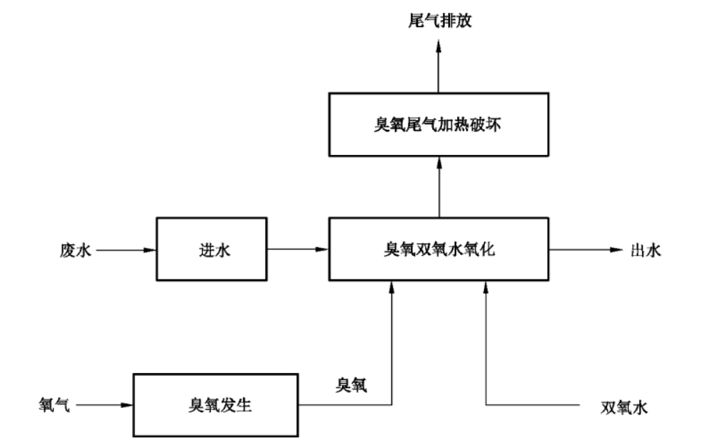 废水经由进水池输送到臭氧双氧水氧化池,通过臭氧发生系统制备的臭氧与双氧水系统投加的双氧水按照一定的比例混合后,在臭氧双氧水氧化池中,通过臭氧气水混合装置及扩散器投加到废水中,并停留一定的时间进行反应,臭氧尾气经臭氧加热破坏器处理后排放。