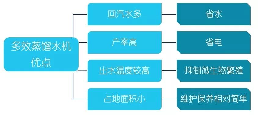 多效蒸馏水机属于塔式蒸馏水机在节能环保方面的升级产品,相比于塔式蒸馏水机,多效蒸馏水机提高了工业蒸汽与冷却水的利用率,极大地解决了设备产能与能耗的矛盾;同时,多效蒸馏水机出水温度较高,有利于注射用水微生物繁殖的抑制,设备占地面积小,维护保养相对简单,现已成为制药行业注射用水主要的生产设备。