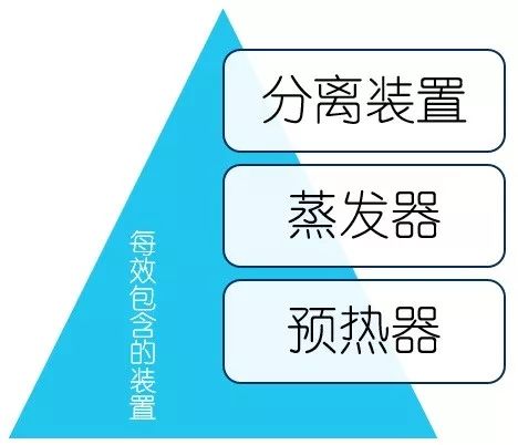 在多效蒸馏水机中,经过每效蒸发器产生的纯化了的蒸汽都是用于加热原水的纯蒸汽,纯蒸汽在加热蒸发原水后经过相变冷凝成为注射用水。常规多效蒸馏水机效数为3~8效,每效包括一个蒸发器,一个分离装置和一个预热器。