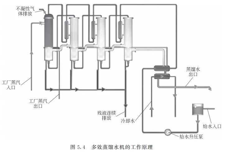 典型多效蒸馏水机的工作原理 (如下图5.4所示):