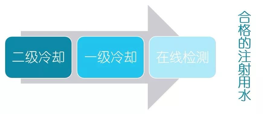 注射用水和纯蒸汽混合物经过第二级冷却 (纯化水为冷介质) 和第一级冷却 (冷却水为冷介质) 后,成为设定温度的注射用水,经电导率仪在线检测合格的蒸馏水作为注射用水输出,不合格的蒸馏水将被自动排放。